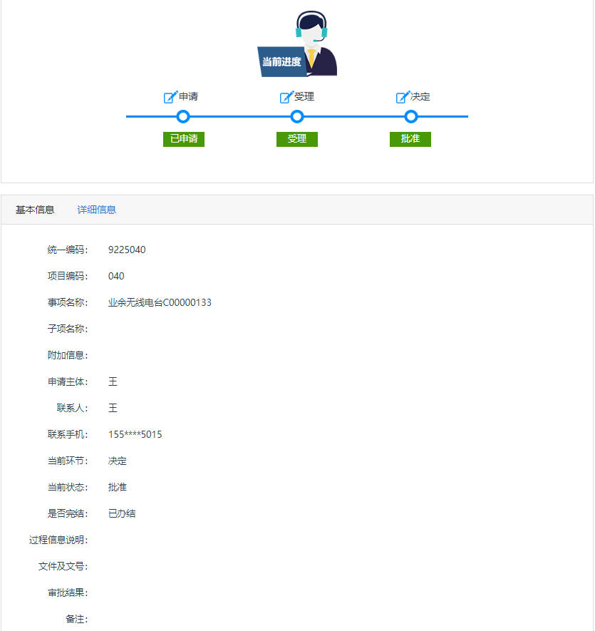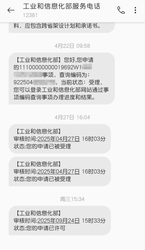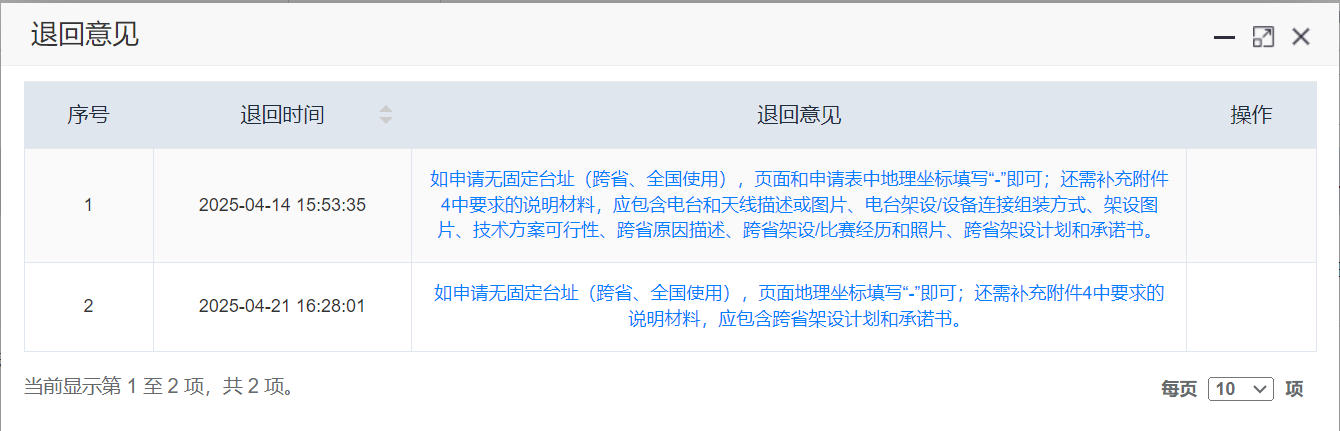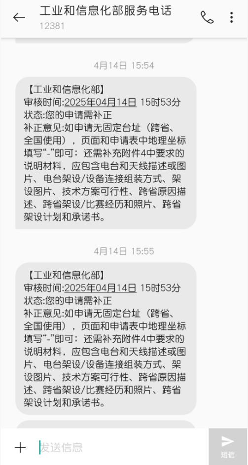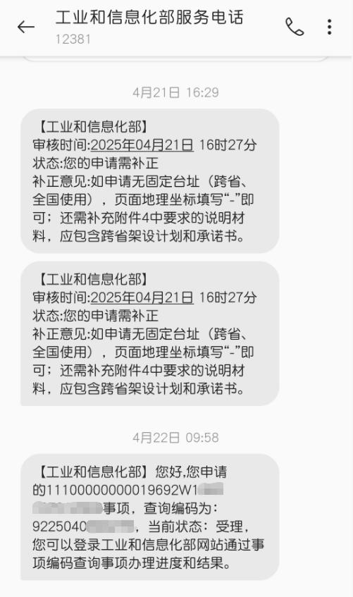 2025年4月21号,由于申请的是全国无固定台址执照时填写了经纬度被再次退回补正,改正后继续提交申请